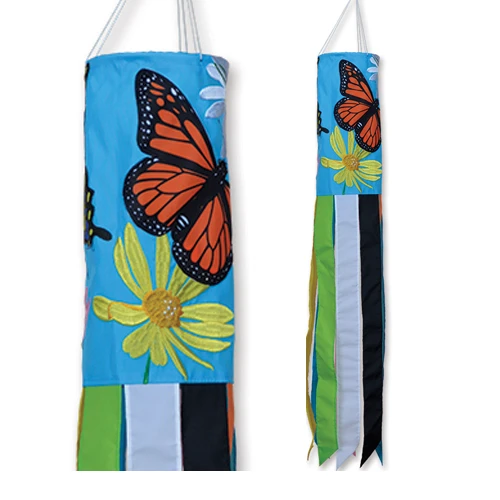 This windsock features bright, fun colors and detailed appliqued graphics with embroidered accents. The windsock’s color coordinating tails flutter whimsically in the breeze.