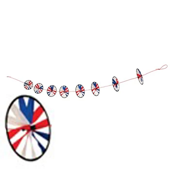 The Patriot Wheel String is a unique hanging spinner with 8 patriotic spinners arranged along a polyethylene string. At almost 18 feet long, this string of spinners can add a lot of color and motion to any outdoor space.